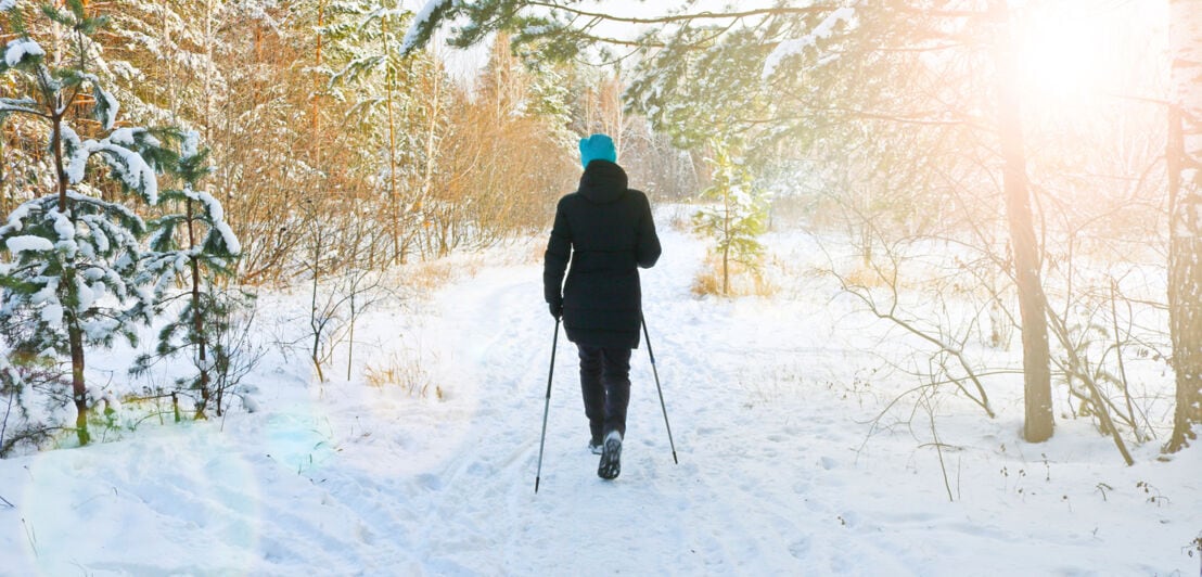 Eine Frau mit Wanderstöcken geht durch einen verschneiten Wald.