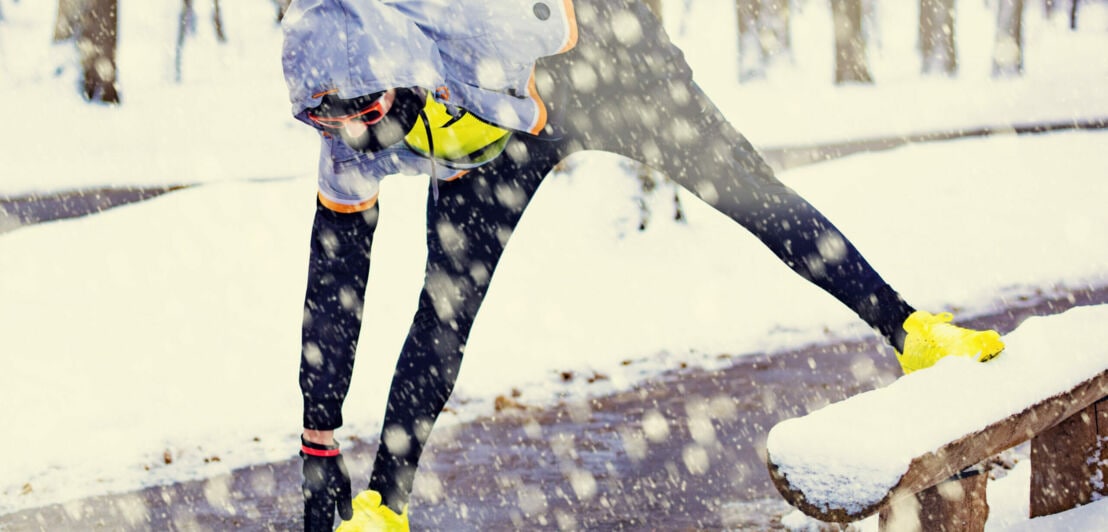 Ein sportlich gekleideter Mensch macht Stretchingübungen im Schnee.