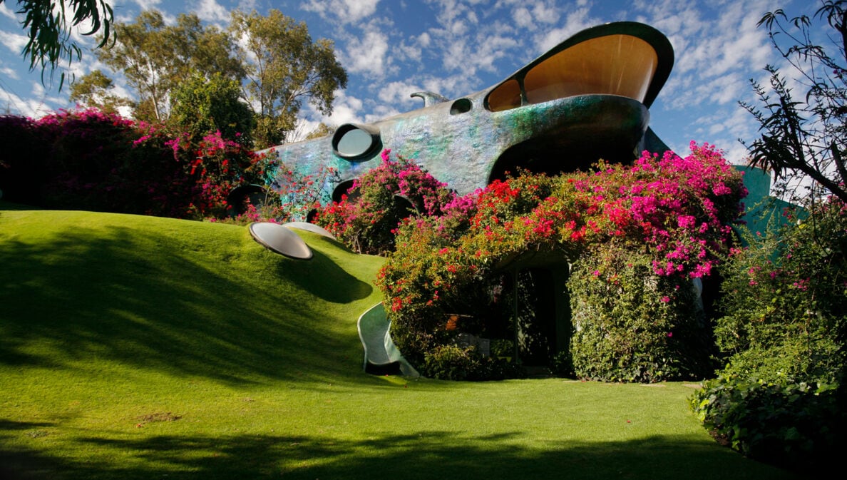 Die Gebäude des mexikanischen Architekten Javier Senosiain Aguilar sind vor allem von seiner Liebe zur Natur inspiriert. Auch das Shark House, das er 1990 in der Hauptstadt Mexikos für sich und seine Familie baute, konzipierte der heute 73-Jährige nach den Prinzipien der organischen Architektur. In dem haiförmigen, in einen Hang hineingebauten Haus ist alles kurvig und fließend. Die Möbel sind so in die Konstruktion eingebunden, als wären sie mit dem Gebäude verwachsen.