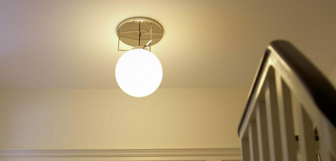 Die Deckenleuchte DMB 26 besteht aus einer Opalglaskugel sowie drei Stäben, die die Kugel mit einer Deckenplatte verbinden. Ihre schlichte Eleganz fügt sich wunderbar in Wohnzimmer, Flur oder Badezimmer ein und verstreut ihr Licht gleichmäßig und unaufdringlich im Raum.