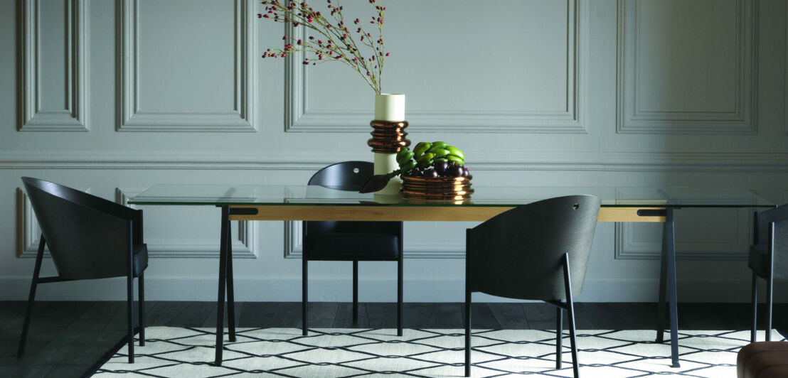 Um 1985 entwarf Philippe Starck den Costes Armlehnstuhl für das Pariser Café Costes. Der Costes, eine elegante Mischung aus Art déco und Postmoderne, fand schnell den Weg aus dem Café ins private Esszimmer. Charakteristisch sind die drei schlanken Beine, die an dem schwarzlackierten Stahlrohrgestell angebracht sind. Die Servicekräfte sollten nicht über ausladende Stuhlbeine stolpern. Die Originalvariante hat Sitzschalen in Mahagoni, seit 2006 werden sie vom Hersteller Driade auch in ebenholzfarbiger Eiche angeboten. Die Sitzkissen sind fest montiert und aus schwarzem Leder.