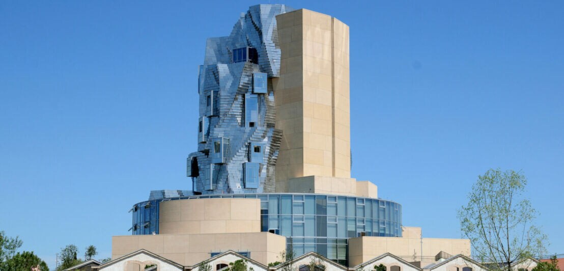 Es sieht aus wie eine riesige, verdrehte Spirale. 11.000 Aluminiumquader und 200 Quadratmeter Photovoltaik verbaute Frank Gehry im südfranzösischen Arles, ein Lieblingsort vieler Künstler:innen, der schon van Gogh und Gauguin anzog. Das Licht der Provence spiegelt, reflektiert und bricht sich auf spektakuläre Weise in der Fassade des 56 Meter hohen Turms mitten im Parc des Ateliers.