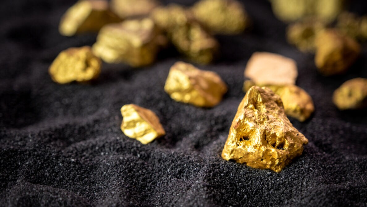 Mittelgroße Brocken aus reinem Gold, Silber und Kupfer auf felsigem Grund mit fließendem Wasser