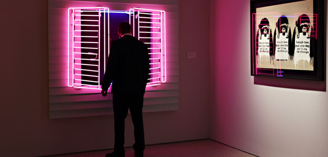 Eine Person schaut sich ein Kunstwerk in der Form eines Fensters aus Neonröhren an der Wand eines Ausstellungsraums an