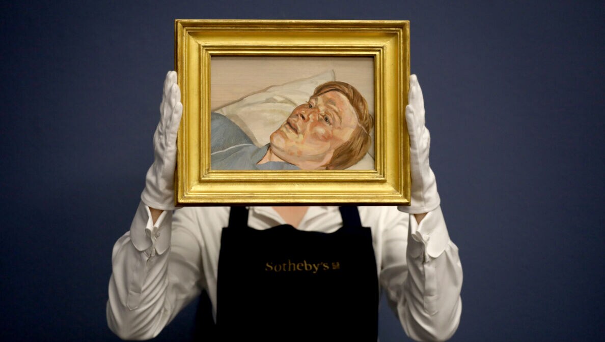 Eine Mitarbeiterin von Sotheby’s hält mit weißen Handschuhen ein kleines Gemälde von Lucian Freud in einem goldenen Rahmen hoch