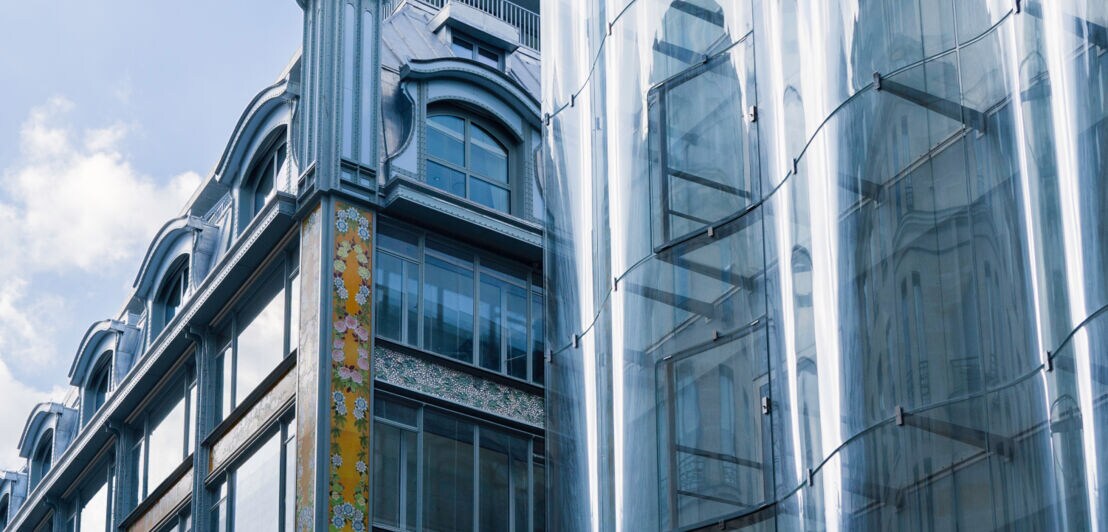 Neben vielen aufwendig restaurierten Originaldetails wie der fünfstöckigen Art-déco-Treppe von Gustave Eiffel und der bekannten Jugendstilfassade an der Pont Neuf gibt es auch einen auffälligen Neubau. Er fügt sich mit den sanften Wellen seiner Glasfront harmonisch in die Rue de Rivoli ein, reflektiert die umliegenden Paris-typischen Haussmann-Fassaden und verbindet Alt und Neu auf gekonnte Weise.