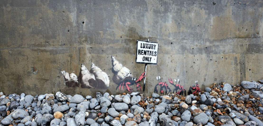 Er ist mit Abstand der bekannteste Street-Art-Künstler, und doch weiß niemand, wer er ist: Der britische Künstler Banksy fasziniert seit Ende der 1990er-Jahre immer wieder mit seinen gesellschaftskritischen Werken. Dabei sprüht er seine Motive mithilfe von Stencils (Schablonen) auf Wände und andere Oberflächen. Banksys Arbeiten sind meist situations- und ortsbezogen und fast immer geprägt von Ironie und Humor. Eines seiner aktuellen Werke an der englischen Nordseeküste zeigt zum Beispiel einen Krebs, der ein Schild mit „Luxury Rentals Only“ hochhält.