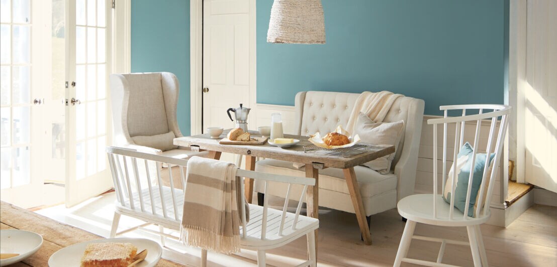 Ein Essbereich mit weißen, hellen Möbeln vor einer hellen, petrolblauen Wand