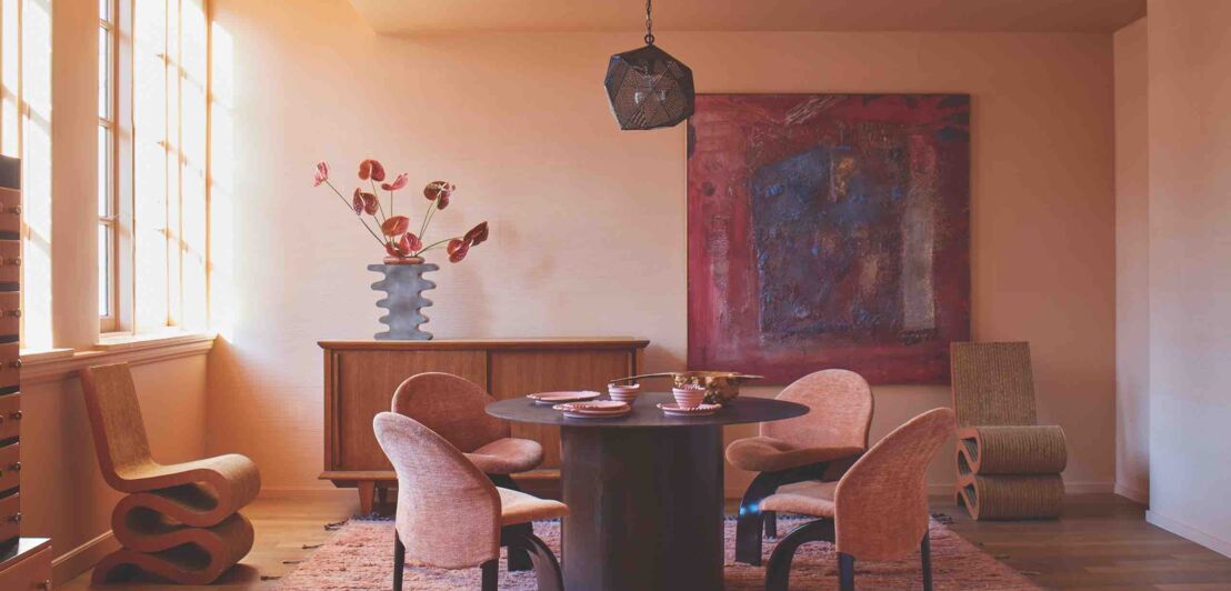Für alle, die das Fernweh packt, ist Terrakotta genau richtig. Das warme Rotbraun erinnert an die Toskana oder auch an antike Kunstwerkstätten in Griechenland und bringt eine große Portion Wärme in die Wohnung. Das aktuelle Erdenrot gibt es auch in vielen edlen und hellen Puder-Nuancen (oder weich-blassen Orangetönen). Es hat nichts mehr von rustikaler, ländlicher Idylle, sondern ist geprägt von einem modernen Mid-Century-Stil, der elegant, clean und natürlich wirkt. Wer sich langsam rantasten möchte, sollte erst einmal mit einer Wand beginnen, das genügt oft schon, um den ganzen Raum neu wirken zu lassen.