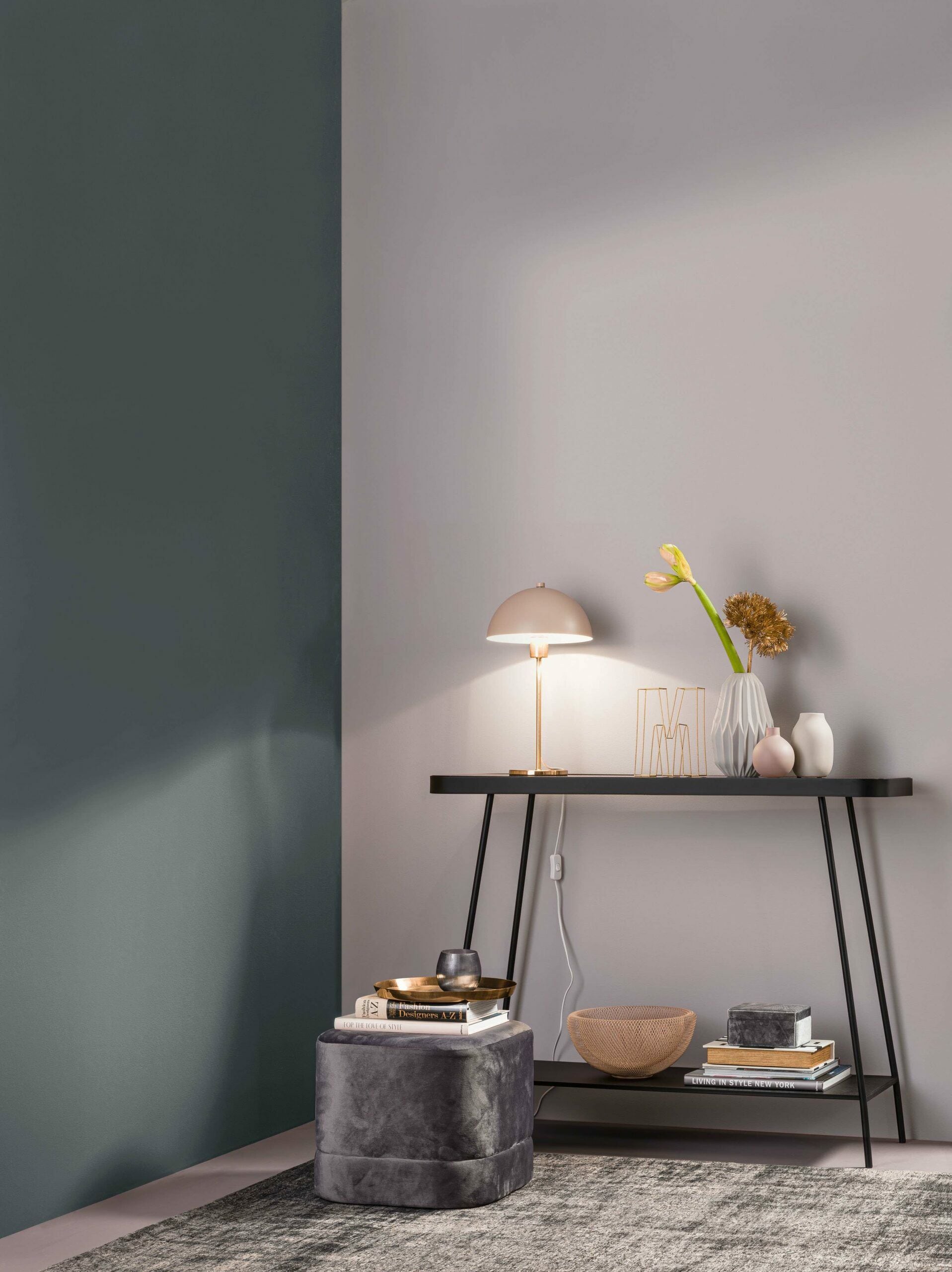 Ein Raum mit einer hellen fliederfarbenen und einer dunklen grau-blauen Wand