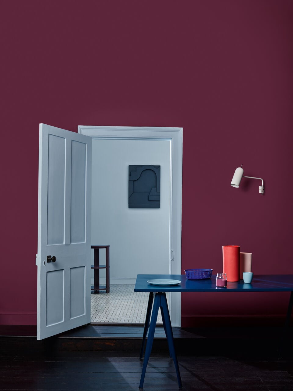 Ein schlicht eingerichteter Raum mit einem blauen Tisch, einer weißen Wand und satt-pinken Wänden