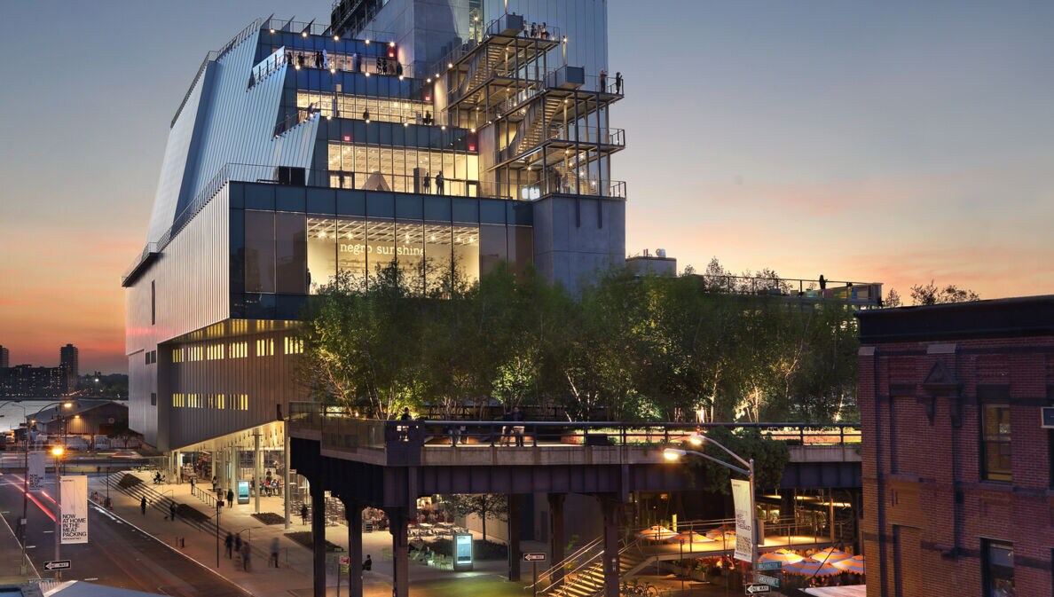 Das von Stararchitekt Renzo Piano entworfene Gebäude verfügt neben einer Dachterrasse mit Restaurant und Blick auf den benachbarten Hudson River auch über einen direkten Anschluss an die berühmte High Line, die stillgelegte und begrünte ehemalige Güterzugtrasse, die seit 2009 kontinuierlich bepflanzt wird und als Parkanlage für Besucher:innen zugänglich ist.
