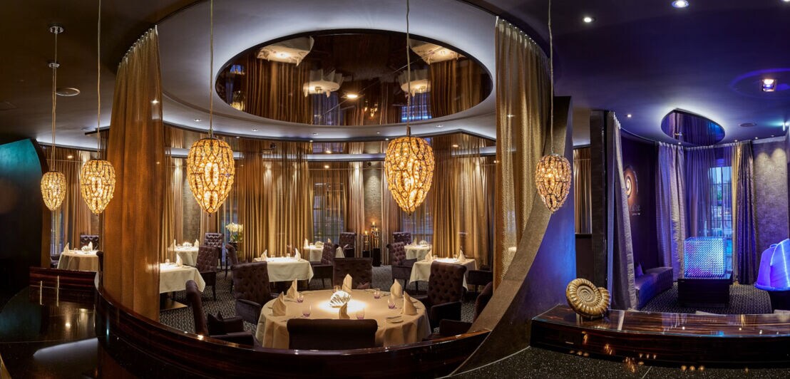Im feinen Ambiente mit lila Samt, Goldvorhängen und Kristalllüstern wird nach Angabe des Restaurants „Hochküche ohne Hokuspokus“ serviert.
