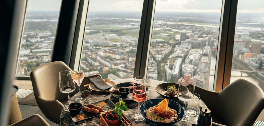 Moderne Fusionsküche, die japanische Gerichte und europäische Klassiker originell verbindet – serviert in einer Höhe von rund 175 Metern: Das bietet dir das Restaurant QOMO im Düsseldorfer Rheinturm.