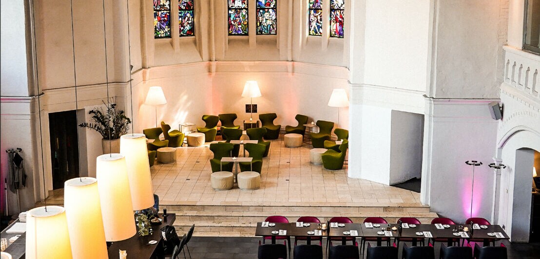 Blick auf Restauranttische und Stühle im Inneren einer Kirche