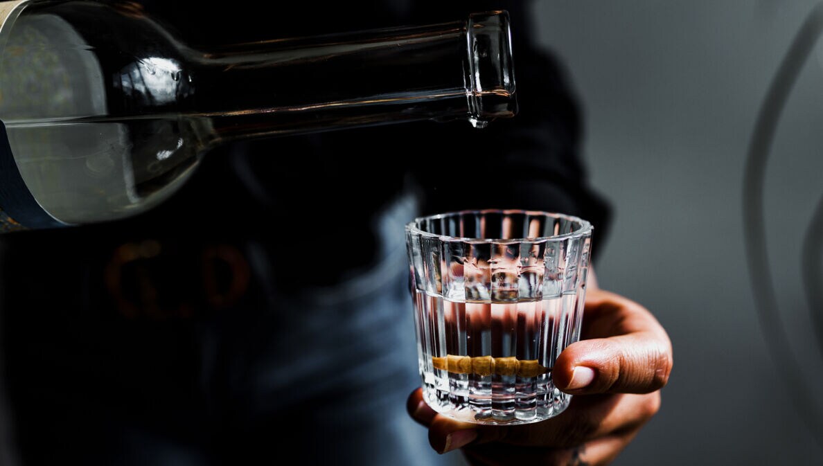 Person gießt klare Flüssigkeit in ein Glas mit Wurm