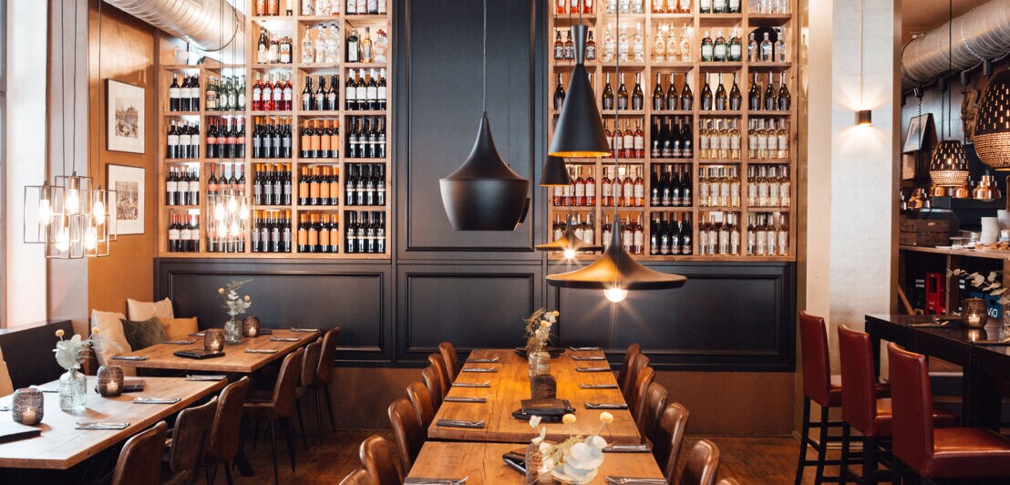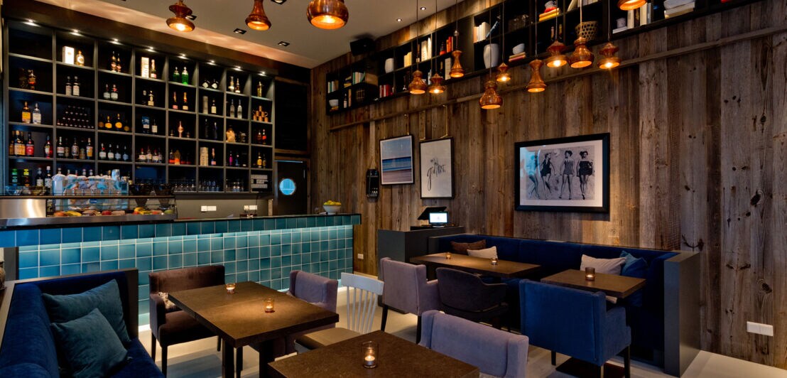 In dem hohen, von Kupferlampen beleuchteten Raum mit gemütlichen Dinnersofas herrscht dezent maritime Stimmung, denn das Lokal befindet sich direkt am Jaffe-Davids-Kanal in Hamburg-Wilhelmsburg. Großer Pluspunkt: die tolle Terrasse!