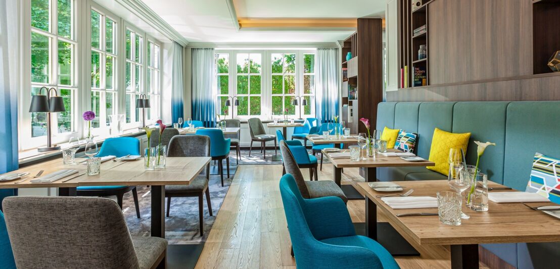 Im Restaurant HORIZON des Hotels Courtyard by Marriott nahe dem Hamburger Airport schmeckt der beliebte Sonntagsbrunch in Hamburg bis 15 Uhr vorzüglich. In dem Raum mit 90 Plätzen sitzt du bequem auf türkisfarbenen Polstersesseln und genießt die Aussicht ins Grüne durch die hohen Fenster.