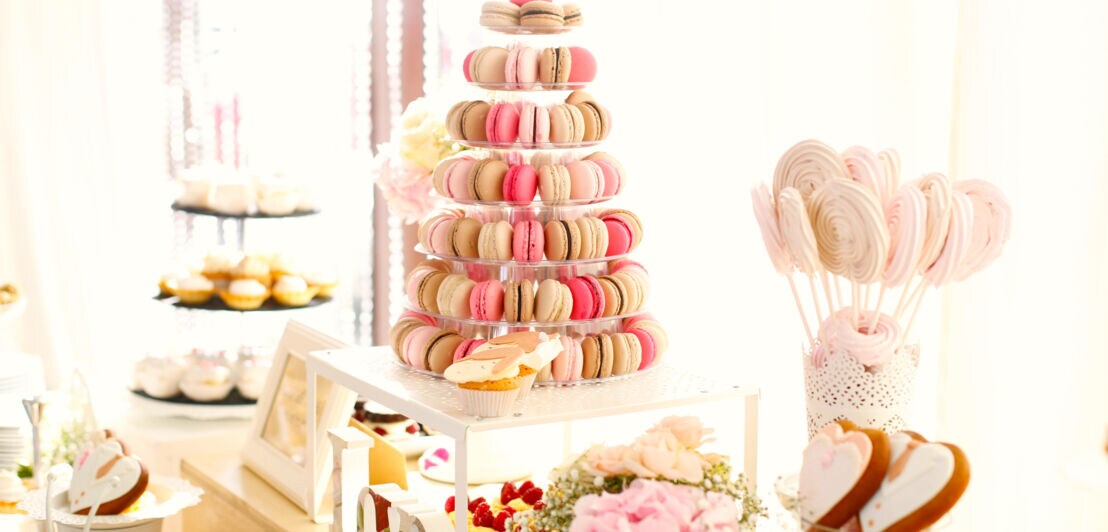 Als Faustregel gilt: Die Candy Bar funktioniert wie der kleine Kiosk um die Ecke, in dem du alle Naschereien findest, die du als Kind geliebt hast. Ein Sweet Table dagegen besteht vor allem aus Gebäck. Das kannst du selbst backen oder in einer Konditorei in Auftrag geben.
