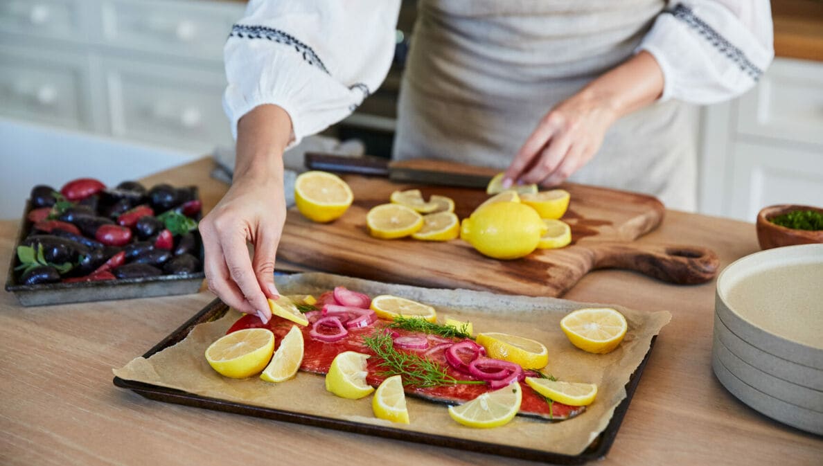 Eine Frau bereitet Lachs mit Zitronenscheiben auf einem Blech in einer Küche zu