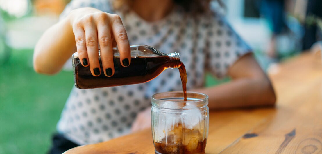 Eine Frau gießt kalten Kaffee in ein Glas mit Eiswürfeln