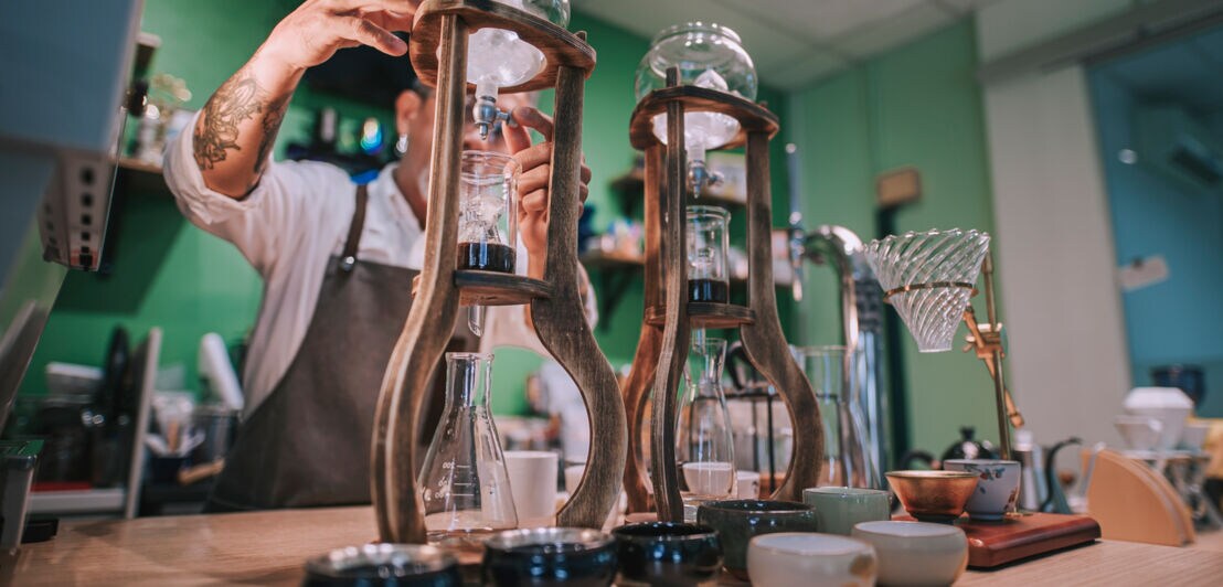 Ein Mann bereitet Cold Brew in speziellen Gefäßen zu.