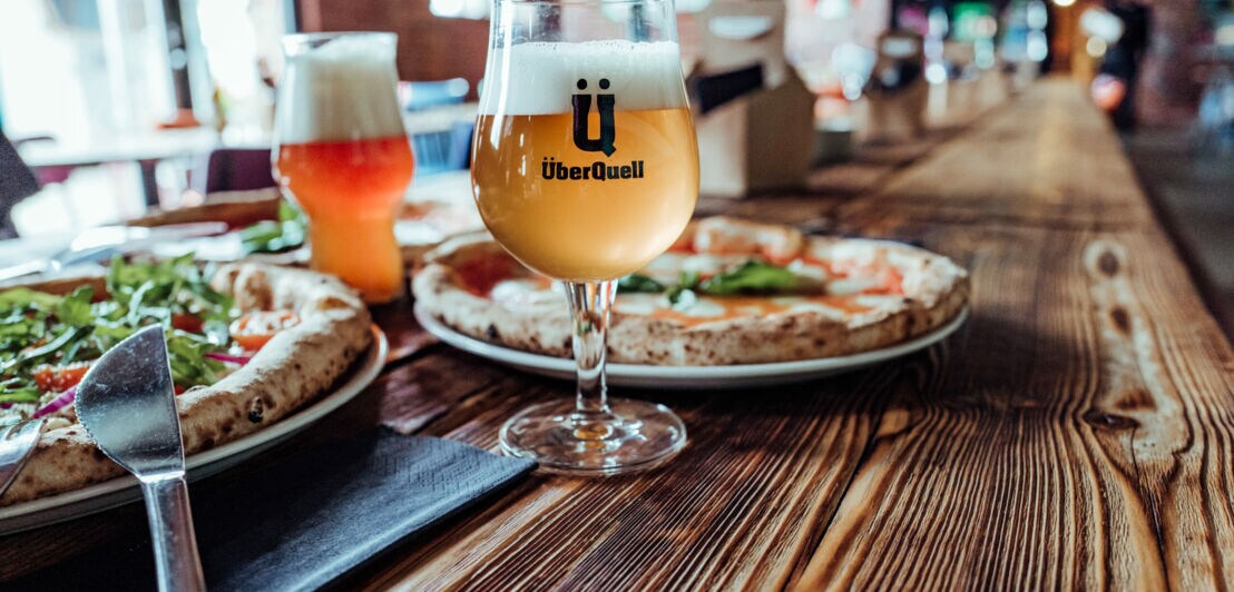 Jedes anders, aber immer besonders: Nach diesem Prinzip kreiert ÜberQuell am Fischmarkt sein Craftbeer, direkt am Hamburger Hafen. In einem ehemaligen Proberaum der Beatles brauen Patrick Rüther und Axel Ohm sieben verschiedene Biere jährlich, dazu saisonale und Limited Editions. Die Hopfengetränke tragen Namen wie Palim Palim Pale Ale und Supadupa IPA. Auch alkoholfreies Craftbeer ist im Angebot, das Pillepalle Ale. Serviert werden die Kaltgetränke im eigenen Restaurant zu neapolitanischer Pizza.