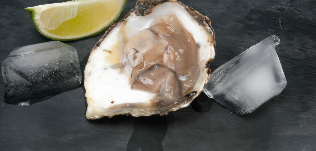 Geöffnete Bélon-Auster mit zwei Eiswürfeln und einem Stück Zitrone