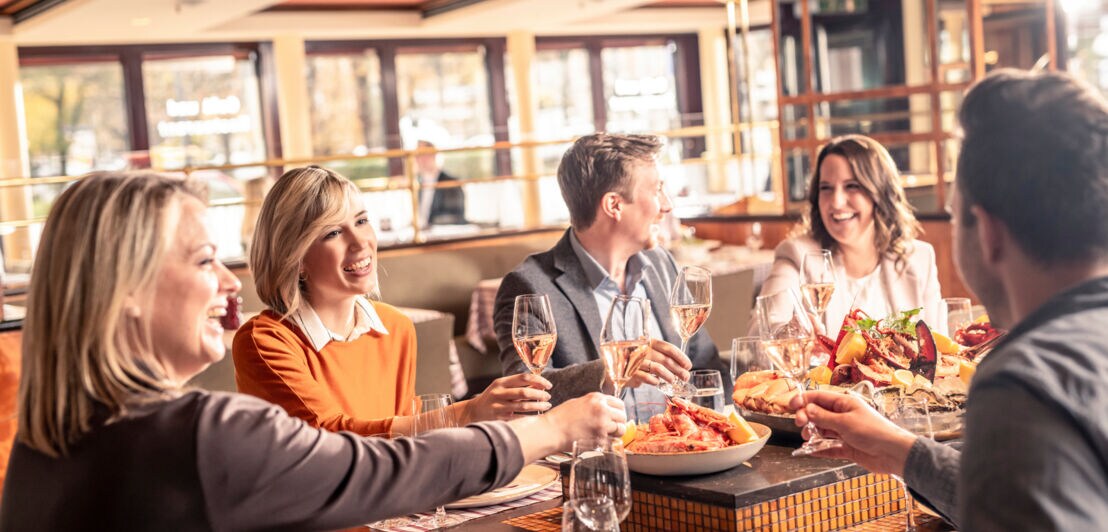Unbedingt probieren: die Meeresfrüchteplatte mit Hummer, Austern, Atlantik-Garnelen, Taschenkrebs und Crevettes – am eigens dafür konzipierten Tisch mit Plateau in der Mitte.