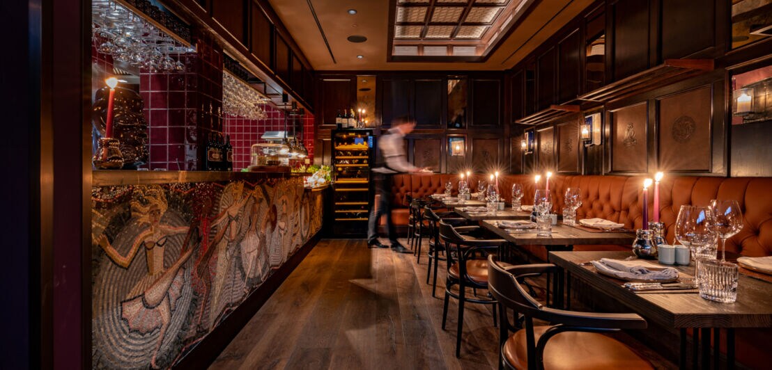 Nur 50 Quadratmeter groß und mit 26 Plätzen, ist das TORTUE der intime Rückzugsort für produktverliebte Fans französischer Küche. Auf weichen Lederbänken im lauschig-dunklen Interieur mit lederbezogenen Wänden und pflaumenblauen Samtvorhängen genießt du hier Rindertatar mit Rauchaal, das das Zeug zum Signature Dish hat, Eintopf vom Atlantik-Hummer oder ein mächtiges Côte de bœuf aus den USA.