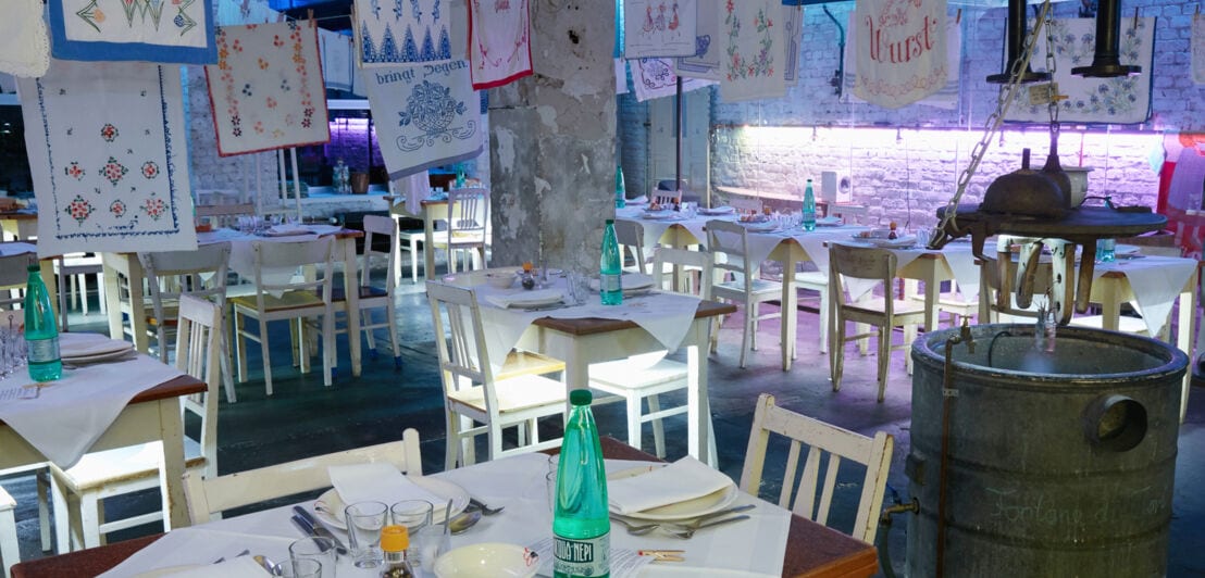 Zwischen Wäschetrommeln und Leinen mit Küchentüchern, Tischdecken und Servietten diniert es sich am geweißten Mobiliar vorzüglich. Was als Projekt unter Freunden begann, hat sich zu einem Ort feinster italienischer Küche entwickelt.