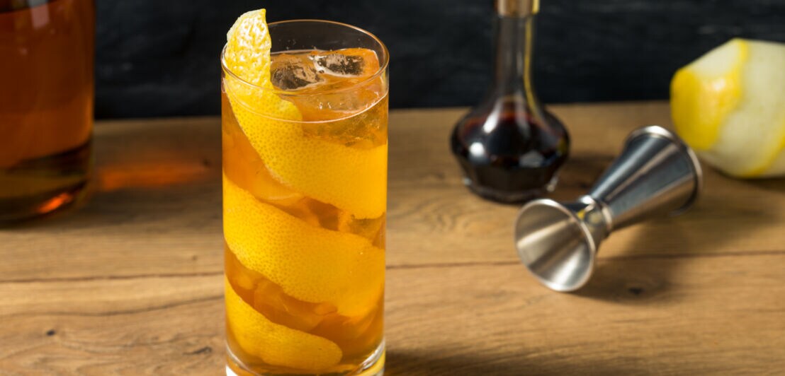 Auch der Horse’s Neck ist ein klassischer Highball. So nennen sich Drinks, für die nur eine Basis-Spirituose verwendet wird. Seinen Namen hat der Cocktail, weil zum Abschluss eine Zitronenspirale ins Getränk kunstvoll drapiert wird, sodass sie über den Rand des Glases herauslugt und wie ein herausschauender Pferdehals aussieht. Beim Horse’s Neck gibt es recht wenige Variationen: