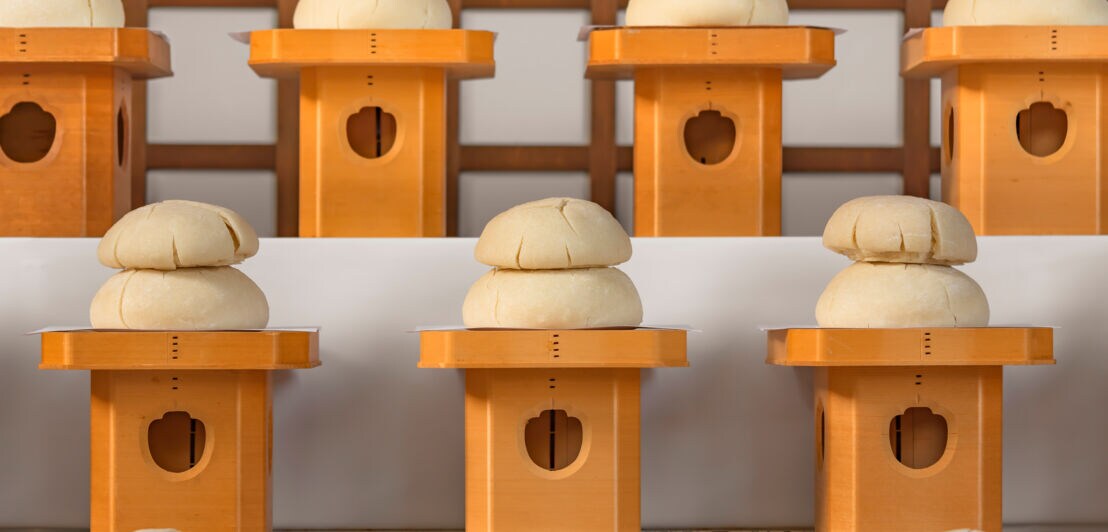 Die traditionelle Neujahrssüßigkeit Kagami Mochi aus Japan besteht aus zwei übereinandergestapelten Reiskuchen.