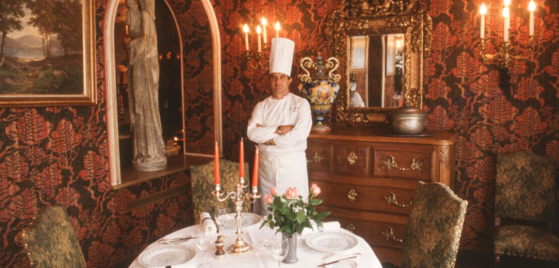 Koch Paul Bocuse vor einem edel gedeckten Tisch im Innenraum eines opulent dekorierten Restaurants mit floralem Wandmuster