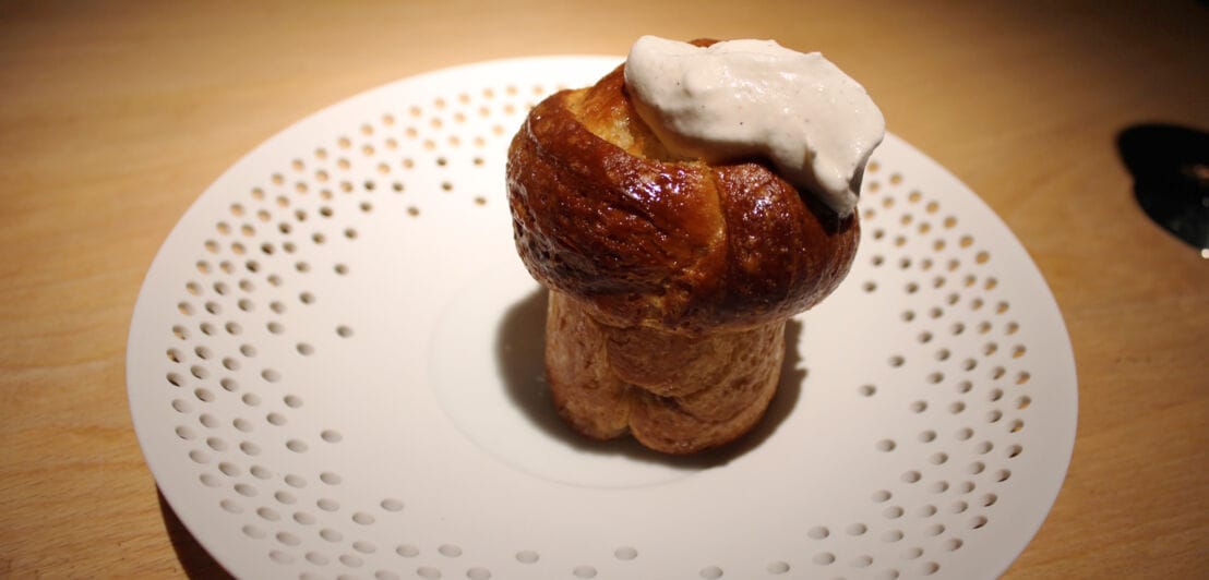 Ein bisschen Bewegung tut gut, schließlich folgt noch der Nachtisch. Da ist er wieder, dieser Duft nach Omas Zimtschnecken, dieses Mal direkt vor der Nase. Eine Brioche in lustiger Pilzform, mit Zimt, Zucker und Butter eine Reminiszenz an die Hamburger Franzbrötchen, erklärt der Kellner. Er rät, Stückchen abzuzupfen und in die süße Vanillesahne zu tunken, und zwar ordentlich: „Viel hilft viel in diesem Fall.“ Wie Recht er hat.