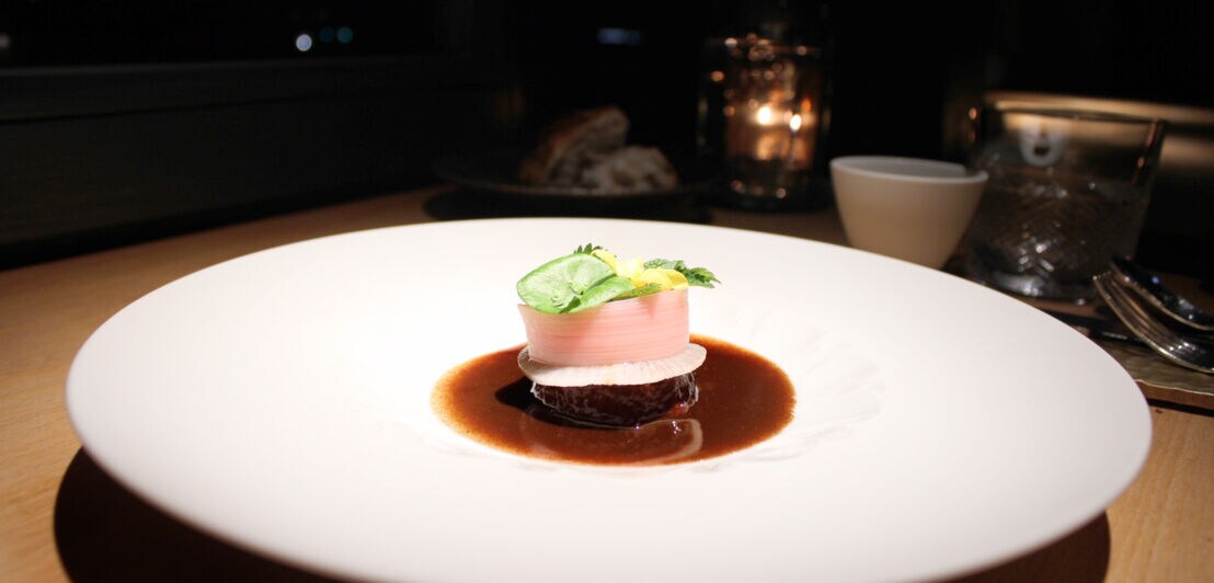 Dann ein törtchenartiges Gebilde: ein Fleischscheibchen von unglaublich feiner Konsistenz und mit einem ungewohnten, fast wildartig anmutenden Aroma, das prächtig mit der leichten Schärfe einer gedünsteten, hauchdünnen Rettichscheibe, der süß-säuerlichen Fruchtigkeit von Rhabarber und frischen Kräutern harmoniert.
