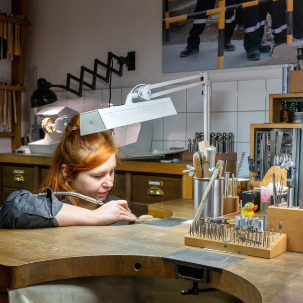 Zur Brotzeit reicht Sophie Lehmann einen 2014er Rosésekt des Weinguts Ziereisen im südlichen Markgräfler Land. Er perlt in dem eiskalten, aus gehämmertem Silber bestehenden Sektkelch von Robbe & Berking.