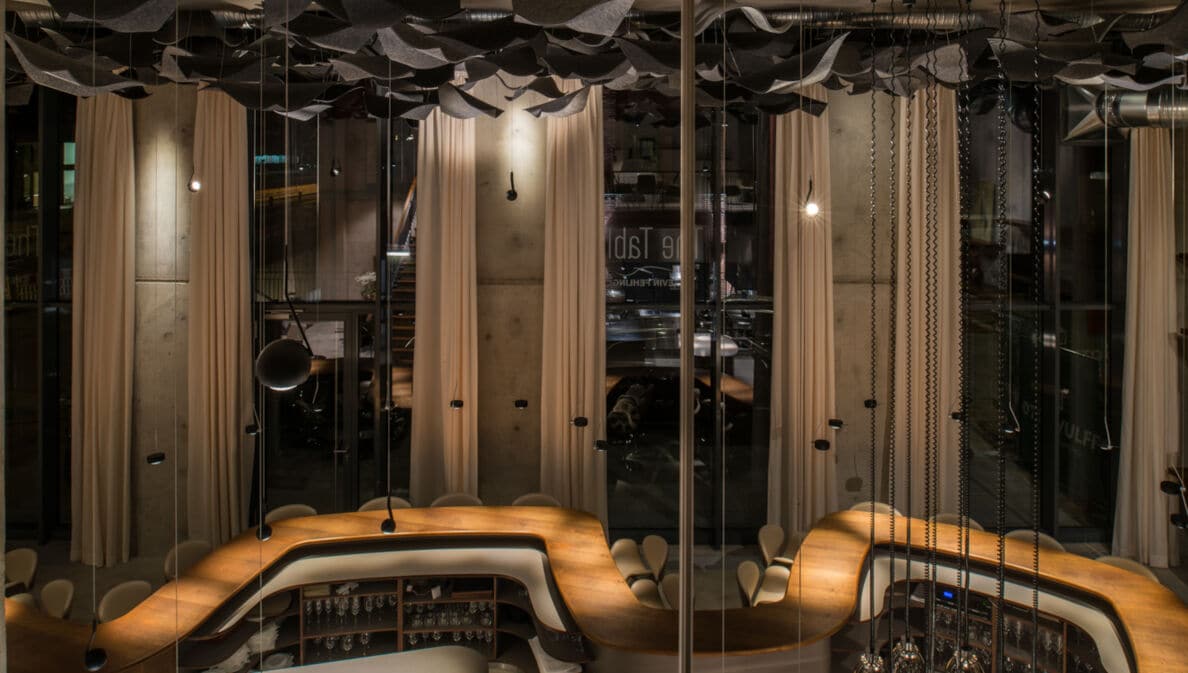 An einem einzelnen geschwungenen Tresen aus dunklem Kirschbaumholz wirst du mit einem Menü der Extraklasse verwöhnt. Der besondere „Esstisch“ ermöglicht Geselligkeit und Privatsphäre, auch Sitzgruppierungen unterschiedlicher Größe sind möglich.