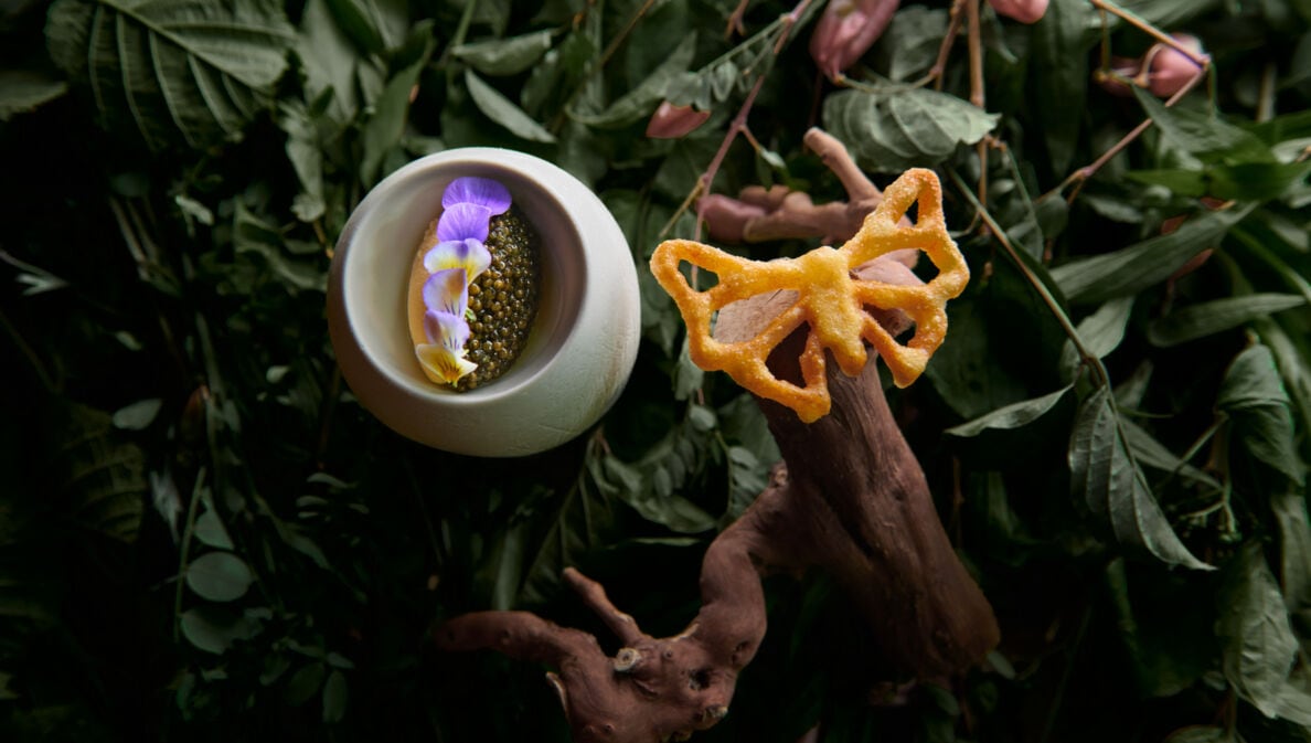 Ein reduziertes Gourmet-Gericht mit Kräutern auf einem grau-melierten Teller, der auf braunen und grünen Grashalmen steht