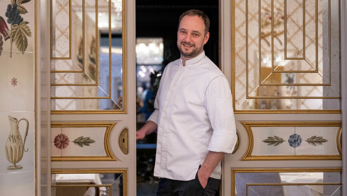 Der Koch Franz-Josef Unterlechner steht in einer geöffneten Flügeltür mit goldenen Verzierungen, Malereien und Spiegelelementen