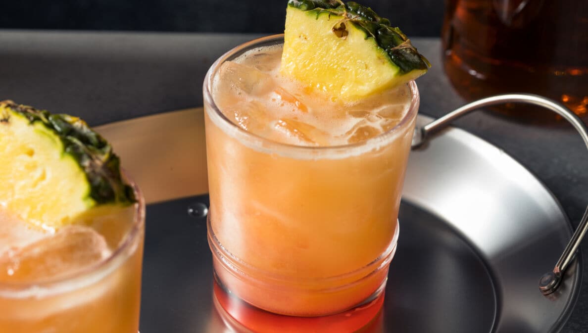 Zwei Gläser auf einem Silbertablett mit orangefarbener Flüssigkeit und einer Ananasscheibe als Dekoration