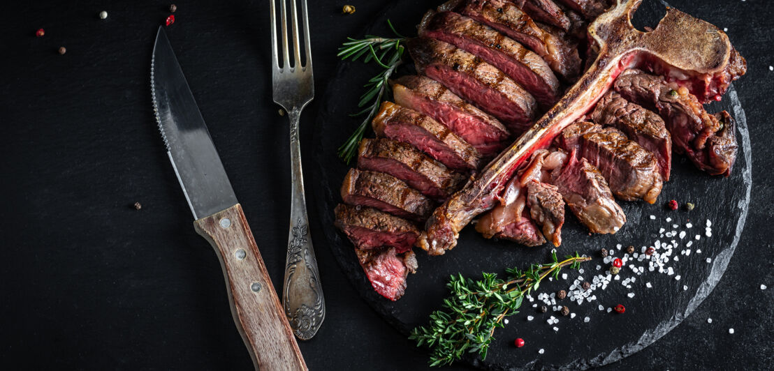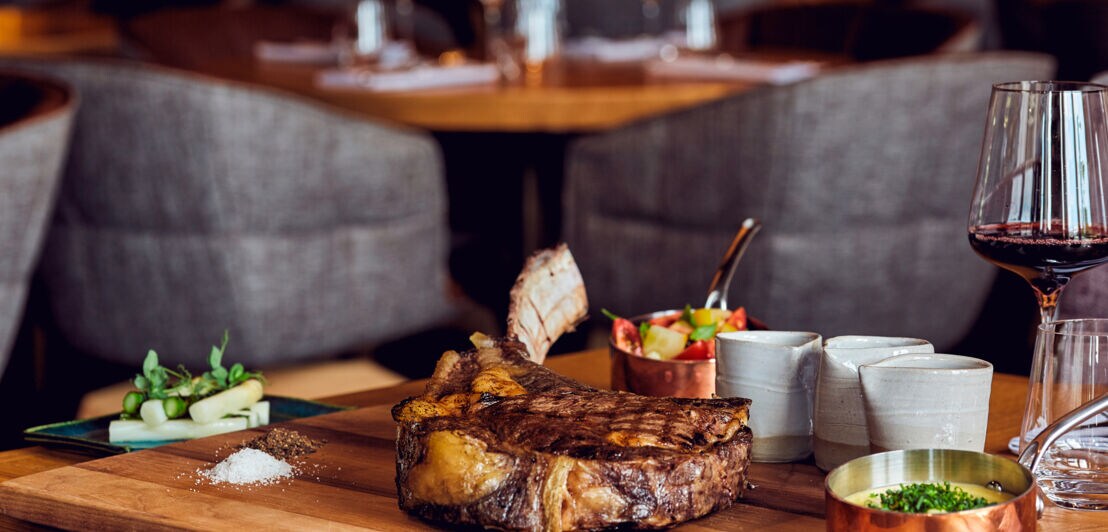 Ob Beef Tartar, Wagyu-Burger oder Carpaccio vom irischen Hereford-Rind: In dem Steakrestaurant in München werden auch Klassiker modern interpretiert und auf Kundenwunsch zu individuellen Menüs zusammengestellt. Ausgewählte Beilagen und raffinierte hausgemachte Soßen begleiten die Gerichte. Dabei achten die Macher:innen stets auf saisonale Auswahl.