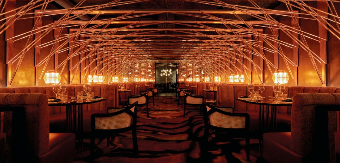 Ein weiteres Highlight neben den köstlichen Sushi-Kreationen ist das Interieur: Für das authentisch-stimmige Design zeichnet die renommierte Designerin Joyce Wang aus Hong Kong verantwortlich – die imposante Einrichtung wird durch einen verspiegelten Raum mit stählerner Installation gekrönt.