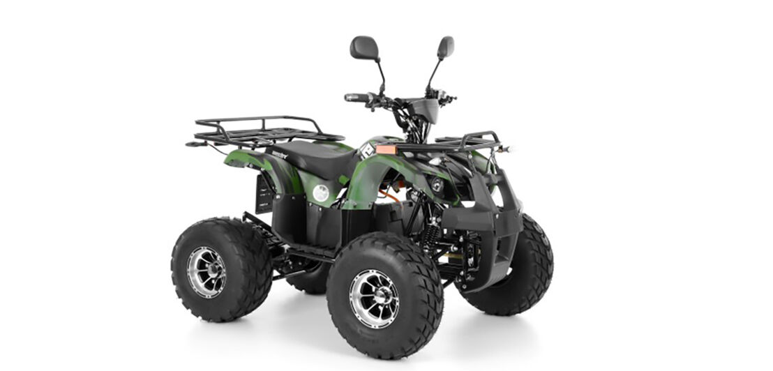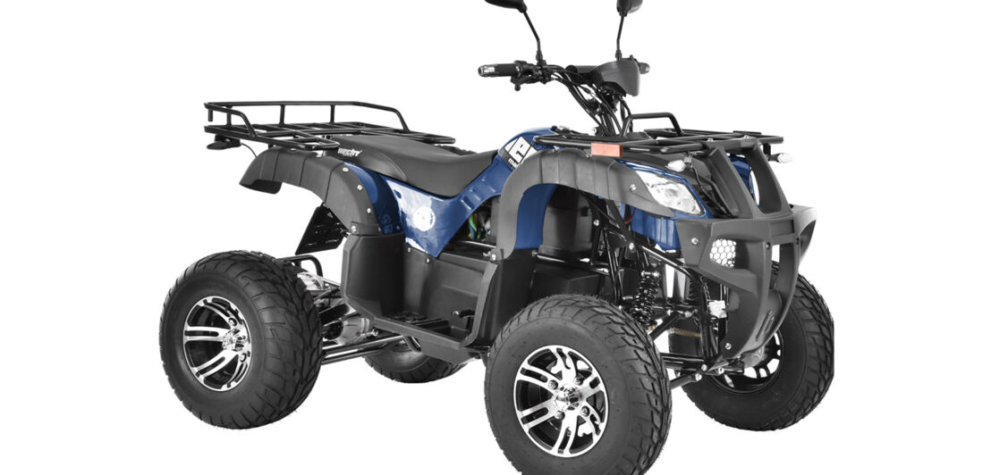 Dieses massive E-Quad (184 x 116 x 110 Zentimeter) des tschechischen Unternehmens für Gartentechnik HECHT ist eines der wenigen Modelle mit Straßenzulassung. Es verfügt über LED-Blinker und Bremslicht, Lampen zum Auf- und Abblenden, Rückspiegel und Hupe.