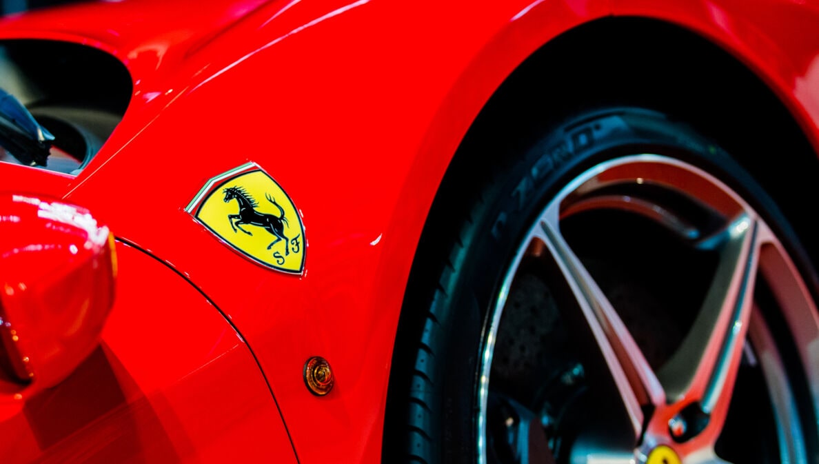 Detailaufnahme eines roten Rennwagens des Herstellers Ferrari mit dem Markenlogo eines sich aufbäumenden Pferdes in einem gelben Wappen