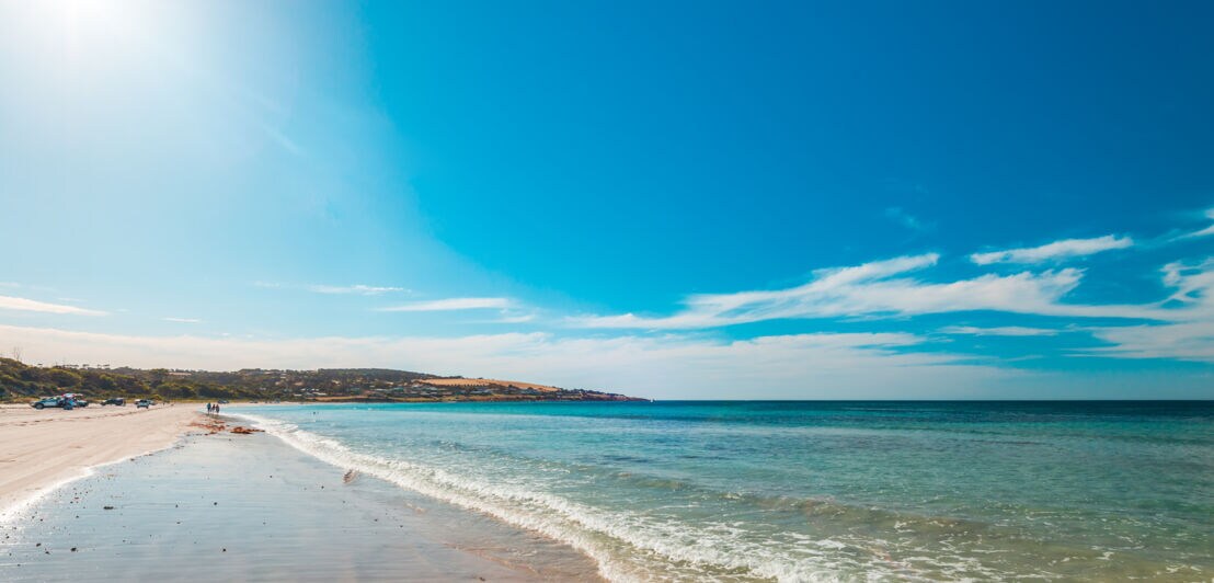 Türkisfarbener Ozean, blühende Büsche, feinster weißer Sand: Nur wenige Autostrände sind landschaftlich so schön wie Emu Bay Beach auf Kangaroo Island. Die Insel liegt im Indischen Ozean vor der Südküste Australiens, gut 130 Kilometer von der Metropole Adelaide auf dem Festland entfernt. Ein Besuch des vier Kilometer langen Strandes lohnt sich vor allem in den australischen Sommermonaten, da die Wassertemperaturen im Winter recht frisch sind.