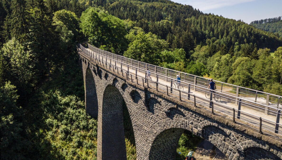 Drei Radfahrende fahren auf einem schmalen Weg auf einem Viadukt in einer hügeligen Waldlandschaft