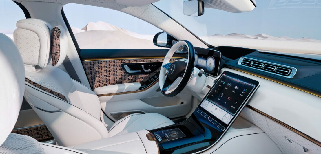 Die Inspiration aus der Modewelt spiegelt sich vor allem im edlen Interieur wider: Hochwertiger Bouclé-Stoff in Blau-, Beige-, Roségold- und Goldtönen, Details aus kristallweißem Leder, Fußmatten aus Leinen und Mohair, roségoldfarbene Champagnerkelche und blau getönte Lederbiesen in den Konsolen machen den Innenraum dieses exklusiven Mercedes-Modells zu etwas Besonderem.