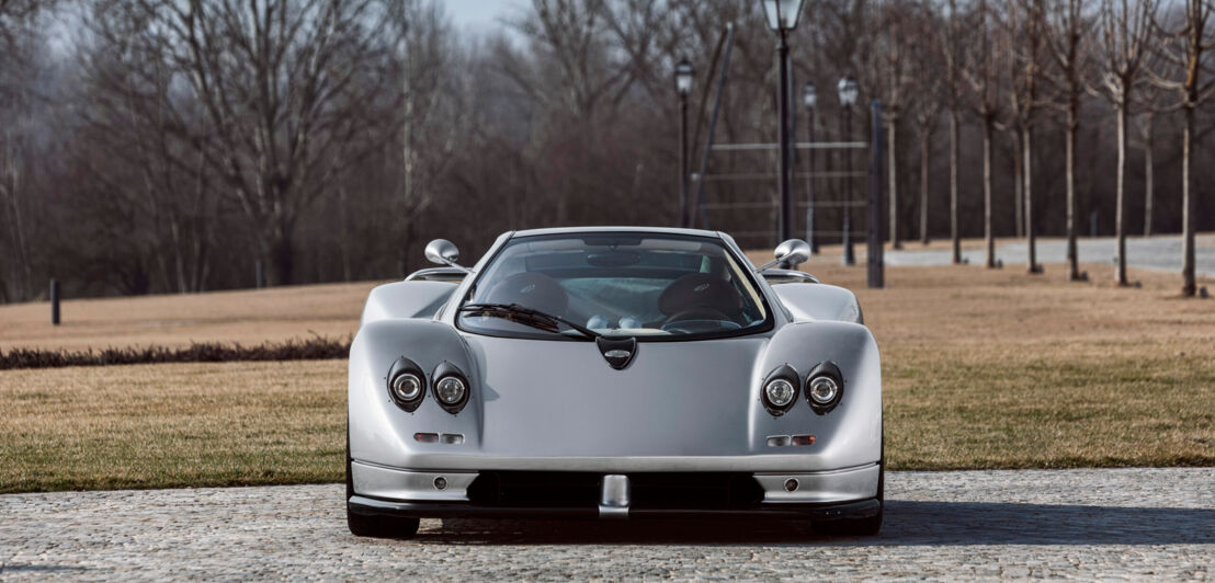 Ein silbergrauer Pagani Zonda C12 steht auf einer gepflasterten Fläche
