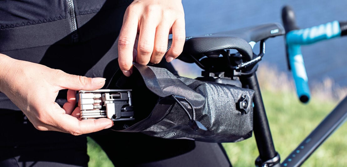 - In die Werkzeugtasche gehören: drei Reifenheber, ein kleines Multitool und ein Ersatzschlauch.